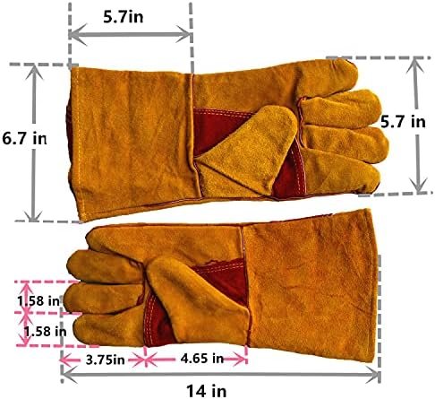Garden gloves size: L x W x H =14 x 6.7 x 0.15 inch /16 x 6.7 x 0.15 inchWork gloves materials: cow split leather; cotton cloth, denim jeanBite proof gloves weight: 0.88 Lb (14 inch),1.28 Lb (16 inch)