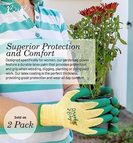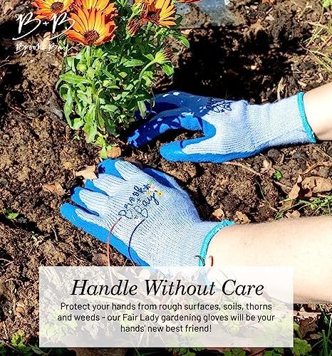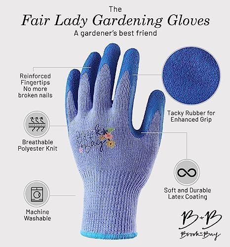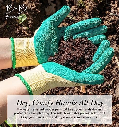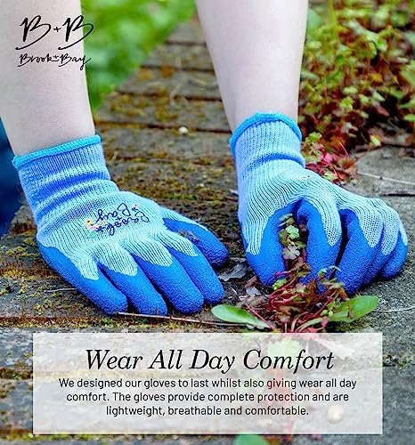 The Brook and Bay garden gloves women are gardening gloves designed for women, by women. The soft and durable latex coating protects your hands from dirt, damp, thorns and abrasion when raking or doing heavy duty yard work. The rubber palm provides tacky grip, ideal for when carrying pots and heavy gardening equipment. Our women garden gloves are great for year round use; in winter the latex coating will keep your hands dry in winter whilst the breathable knit fabric will keep your hands cool and try in summer. Our woman garden gloves will be your hands new best friend – no more dry hands, calluses and broken nails.