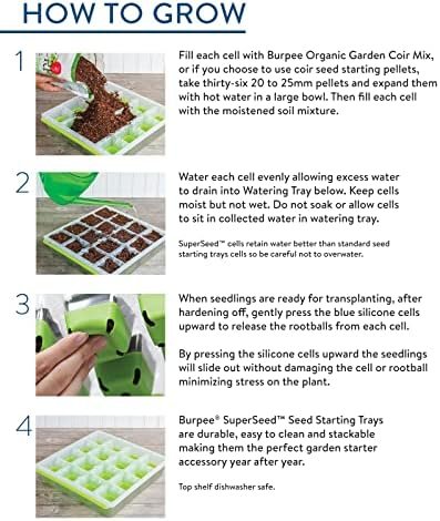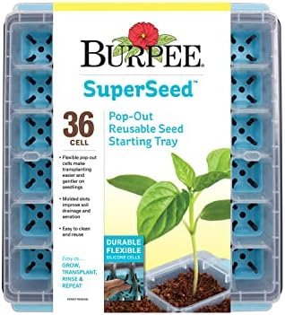 Our Burpee SuperSeed™ seed starter tray with 36 flexible pop-out cells is designed to make indoor seed starting a breeze! Soft food-grade silicone cells cradle seedlings and gently pop out to reduce stress during transplanting into your outdoor garden or patio pots. Molded corner slots in each cell improve drainage and soil aeration to set your herb, flower and vegetable seeds up for germination success. Deep channels in the watering tray draw excess away from the cells, while the raised perimeter edge keeps water contained in the tray – no spills! Seed tray side handles make it easy to lift and pour off excess water or check on seedlings. Rows are labeled alphanumerically for seedling identification with included Plant-o-Gram diagram. After transplanting, seed trays are easy to clean and reuse or simply store for next growing season! Top shelf dishwasher safe. 100% GUARANTEED: Burpee is committed to the success of all gardeners. We treat each order with care to ensure healthy seeds, plants, seed starting mixes and gardening supplies are packaged and sent in excellent condition. If you are unsatisfied with your purchase, we aim to make it right!