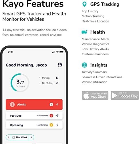 MANAGE YOUR VEHICLES IN REAL TIME: Kayo gives you instant data about your vehicle whether its running or not; anytime, anywhere – including GPS tracking info, maintenance alerts, driver behavior, vehicle health, and more.