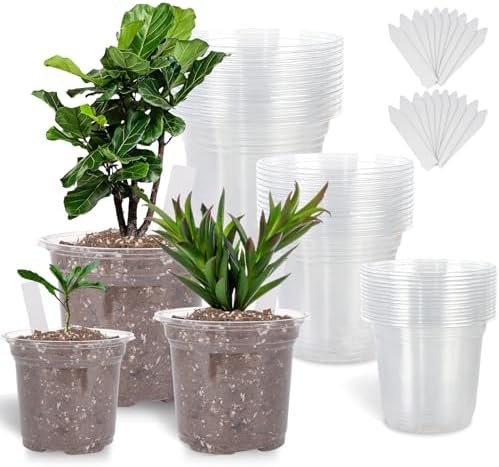 CEWOR 48pcs 5/4/3.5 Inch Clear Nursery Pots for Plants Nursery Pots with 20pcs Plant Labels, Sturdy Seedling Plastic Plant Pots with Drainage Holes, Flower Plant Seed Containers