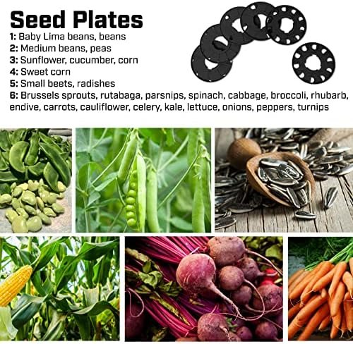 6 SEED PLATES: switch up the plate depending on your type of vegetable, works with up to 20 seed types – baby Lima beans, baby beans, medium beans, medium peas, sunflower, cucumber, corn, sweet corn, small beets, radishes, Brussels sprouts, rutabaga, parsnips, spinach, cabbage, broccoli, rhubarb, endive, carrots, cauliflower, celery, kale, lettuce, onions, peppers, turnips