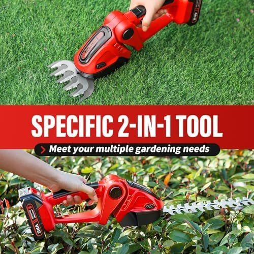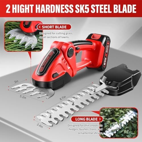 【2-IN-1 HAND TRIMMER】ARTCYL electric hedge trimmer & grass shear is designed with switch from grass shear to hedge trimmer quickly and easily with blade release buttons.The short blades (5.1 inches in width) are designed to cut lawns and small patches of grass, and the long blades (8.7 inches in length) are designed to cut fine branches on hedges, bushes, trees, and ornamental shrubs.