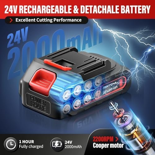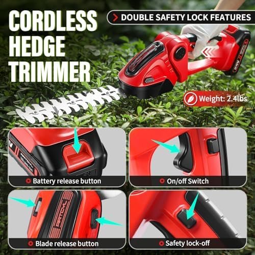【2 Removable Rechargeable Battery】The handheld hedge trimmer is powered by a rechargeable and removable lithium battery (24V 2000mAh), easy to use. No need for power outlets or extension cords, it can be fully charged in 2 hours and can work anywhere for about 60 minutes. With two removable batteries included in the package, you can be sure that the cordless lawn trimmer and shrub trimmer has enough power to complete your gardening/pruning tasks without interruption.
