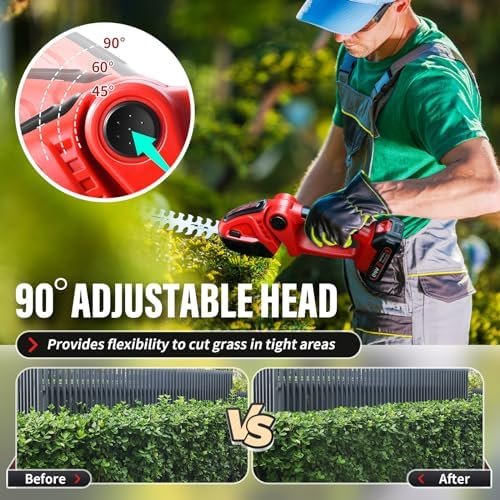 【90°ADJUSTABLE HEAD & FLEXIBLE CUTTING】The battery-powered cordless grass shear head has 3 adjustable angles (45°, 60° and 90°) for flexible mowing in confined areas, providing a comfortable mowing experience, relieving the burden on your wrist and shoulders, and allowing you to customize your mowing program according to the terrain and grass height. Its powerful 1200rpm no-load speed ensures optimal cutting results, making your mowing job easier and more efficient.