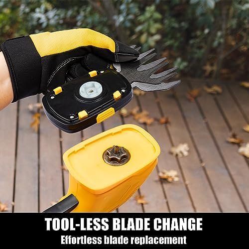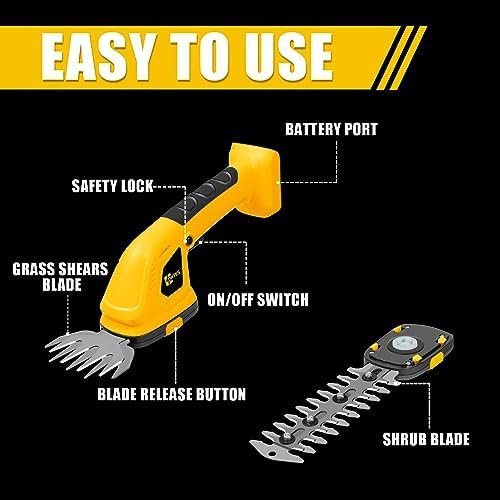 2 in 1 Versatility: Conveniently switch from grass shearing to hedge trimming by changing blade with one click in one tool. Simply prune branches with the long blades (4-3/8 inches long) and shear grasses with the short mowing blades (3-9/16 inches wide)
