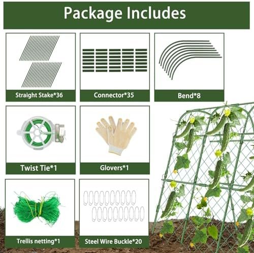 Value Package:cucumber trellis for raised bed garden including 70*106in trellis netting*1, straight tube * 36, curved tube * 8, connecting pipe*35, steel wire buckle*20, twist tie*1 ,Gloves*1. The assembled dimensions are 63″L*47″W*47″H.