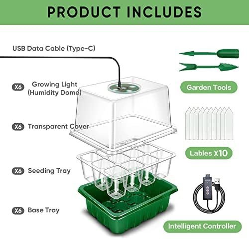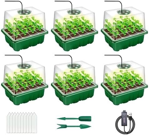 【Complete Seed Starter Kit】6 sets of seed germination boxes,each one comes with a 12-cell insert tray, transparent cover, full-spectrum plant grow light with 8 LEDs, timing controller adjustment brightness, and a base tray, along with 10 plant tags and 2 seedling tools. This all-in-one kit makes it easy for gardening enthusiasts and beginners to start seedlings plants.