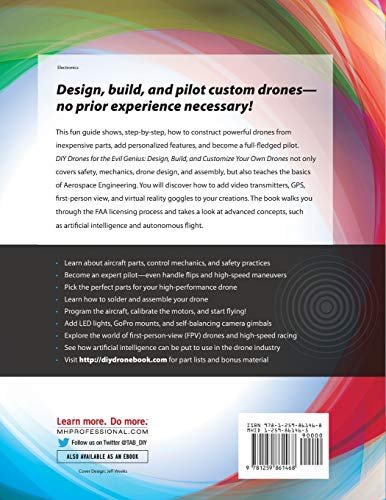 This fun guide shows, step-by-step, how to construct powerful drones from inexpensive parts, add personalized features, and become a full-fledged pilot. DIY Drones for the Evil Genius: Design, Build, and Customize Your Own Drones not only covers safety, mechanics, drone design, and assembly, but also teaches the basics of Aerospace Engineering. You will discover how to add video transmitters, GPS, first-person view, and virtual reality goggles to your creations. The book walks you through the FAA licensing process and takes a look at advanced concepts, such as artificial intelligence and autonomous flight.
