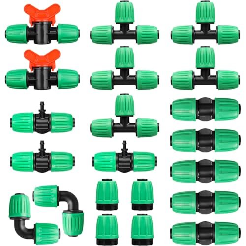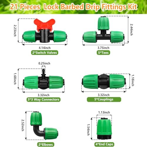 【PACKAGE LIST】The 1/2 inch drip irrigation parts kit includes 5pcs barbed couplings,5pcs barbed tees,4pcs end cap,3pcs 3 way 1/2″ to 1/4″ connector,2pcs switch valves,2pcs elbows, which let you connect your irrigation systems as you wish.