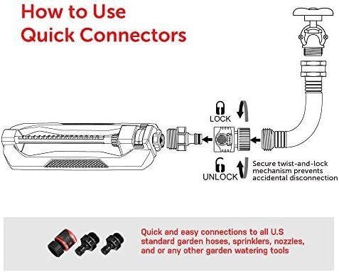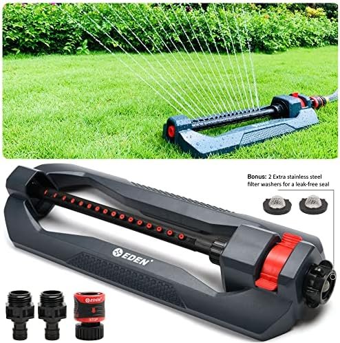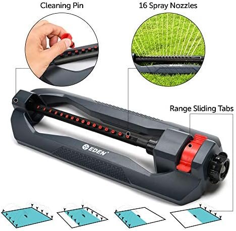 Keep your lawn and gardens green and beautiful with the Eden Turbo Oscillating Sprinkler. Smooth, quiet control tabs let you easily adjust your watering area for precise watering exactly where you want. The turbo drive motor and 16 clog-resistant nozzles deliver consistent watering for lawns, vegetable gardens, and flower beds. The Turbo Oscillating Sprinkler offers durability and control. The rectangular spray pattern can be adjusted for superior coverage up to 3,600 sq. ft.(335m²) tested at 40 P.S.I (Dynamic) in a wind free environment. The sliding tab range controls adjust the length of the watering area for precision watering – from a large lawn to a smaller garden. The patented, sealed turbo drive motor ensures smooth operation regardless of water pressure for reliable performance and a longer gear life. The extra-large base offers added stability and durability. The built-in cleaning tool helps unclog nozzles for years of reliable operation. The included Quick Connect Starter Set allows you to connect and disconnect the sprinkler or other watering tools with ease. The lock feature secures the sprinkler in place preventing any accidental detachment. Use the additional Product Adapter for your nozzles, wands, or other watering tools to switch between tools, even with the water running. No more hose kinking or twisting as the Quick Connect allows you to swivel your hose 360 degrees. Keep your Turbo Oscillating Sprinkler working at peak performance with the included stainless steel filter washers for a leak-free seal.