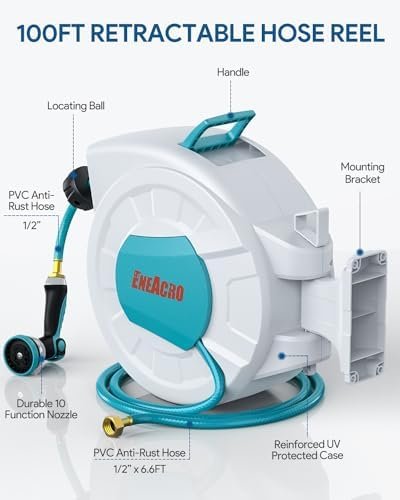 ✅【WHAT YOU WILL GET】 – 1 * ENEACRO 1/2″ x 100FT Retractable Garden Hose Reel. 1 x 10 Patterns Hose Nozzle. 1 x Connecting Rod. 1 x Wall Mount Bracket. 4 x Wall Mounting Screws. 4 x Expansion Tube. Defect Free Warranty and 8 Working Hours Reply Customer Support. We always get your back from the time you choose ENEACRO.
