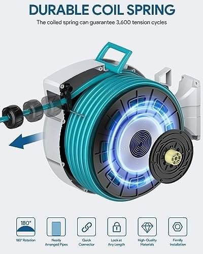 ✅【HIGH QUALITY MATERIAL & 180 DEGREE COVERAGE】- With 350 PSI high pressure, the abrasion-resistant hybrid hose ensures the hose reel leak-resistant and long-lasting. The brass connector can last for a longer time and the impact-resistant wall bracket allows the Hose Reel to pivot 180 degrees to reach every part of your garden. The Hose Reel can easily be removed from the wall bracket to be stored away during winter.