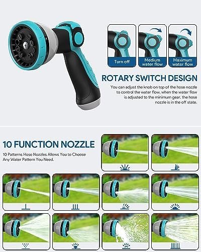 ✅【10 PATTERNS WATERING HOSE NOZZLE】 – The hose with 10 patterns hose nozzle allows you to choose any water pattern you need. Whether you need to water your garden, water your flowers, rinse the ground, give your pet a bath or rinse the stains off the surface of your car, it’s got you covered! With the built-in handle you can carry it with ease.