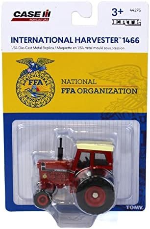 This 1/64 scale International Harvester tractor is made by ERTL! This tractor is a replica of the International Harvester 1466, including special Black Stripe paint scheme and decoration. It has a wide front axle, and it features the FFA logo printed on its hood. According to the manufacturer, this item has a recommended age of 3+ years, making it great for both collecting and for play!
