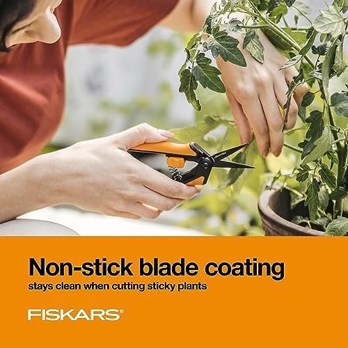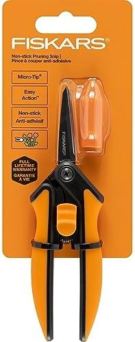 The Fiskars Micro-Tip Pruning Snips with sharp precision-ground stainless steel blades are an ideal addition to your gardening essentials. The steel blades stay sharp through heavy use and provide durability for lasting value. The low-friction blade coating makes smooth cuts, reduces gumming, and enhances rust resistance, and the non-slip grip handle allows for more control of the clippers. The micro-tip pruning snips garden tool makes precise cuts to small plants and leaves with ease and is ideal for both indoor and outdoor plants.