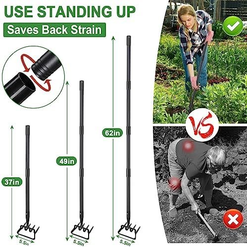 ADJUSTABLE HANDLE LENGTH: Adjust the handle length of this garden hoe and tiller by adding or removing extensions. 62″ long handle allows for standing up gardening.