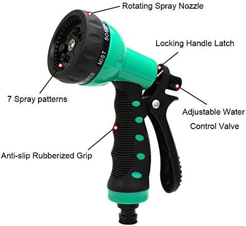 Comes with 7 patterns (Jet,Shower,Flat,Center,Cone,Full and Mist ) adjustable spray nozzle for satisfying your different watering needs. such as general cleaning, gardening, car washing, and pets showering etc.