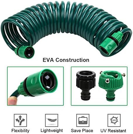 -Light weight but strong and durable, UV resistant EVA construction and coiled design, no kinks, no tangles, no hassles, effortless to operate, ideal for outdoor, garden, yard, lawn, greenhouse, flower beds, etc.