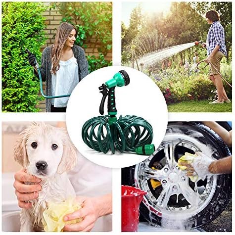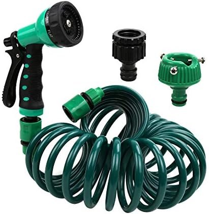 25-ft long (when fully extended) premium EVA coiled garden water hose with fittings reaches far and beyond while in use and retracts to its original compact form for easy and convenient storage after use, a 7-pattern spray nozzle is included.