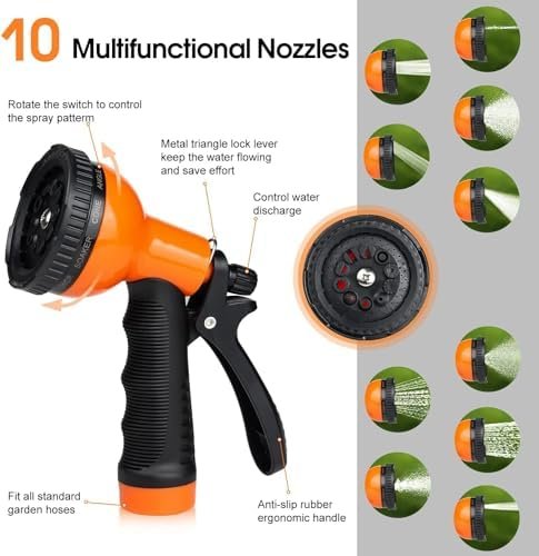 Versatile Spray Nozzle with 8 Patterns: With our upgraded integrated design of the sprayer nozzle, you can easily control water flow from zero to the maximum with your thumb while choosing between 8 different spray patterns including gardening, watering plants or lawns, car/boat washing as well as pet bathing or pool cleaning.