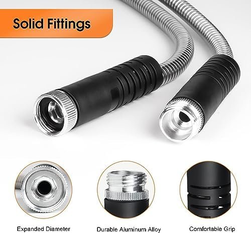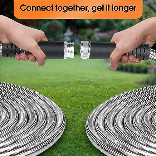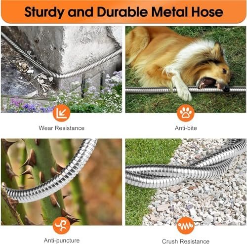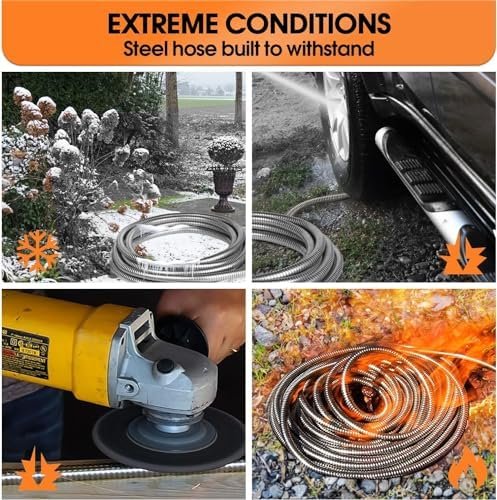 Durable and Long-Lasting: Our heavy-duty industrial stainless steel garden hose is designed to withstand harsh conditions without rusting, corroding, scuffing, leaking, or tearing. It offers premium durability and can endure pet bites, cacti puncture, dragging through dirt and rocks, and more. Compared to traditional garden hoses, it has a longer service lifespan.
