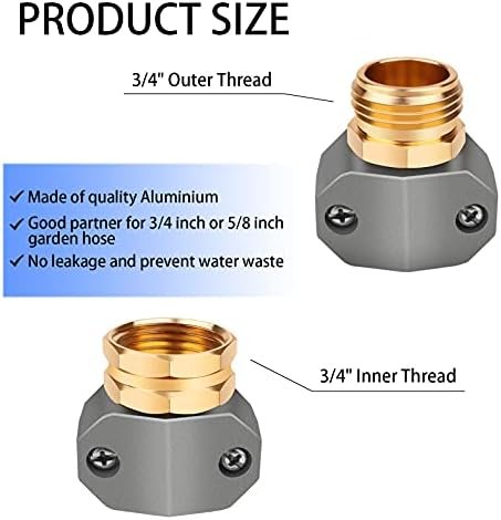 Jeeker garden hose repair fittings, 2 sets of Aluminum mender female and male hose connector, zinc clamp with stainless steel screw, suitable for 3/4″ and 5/8″ garden hoses.
