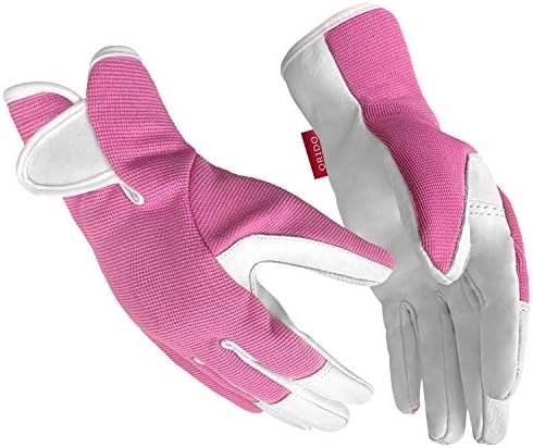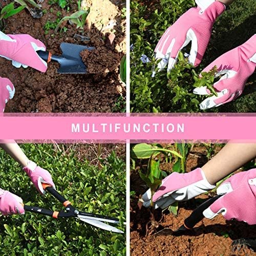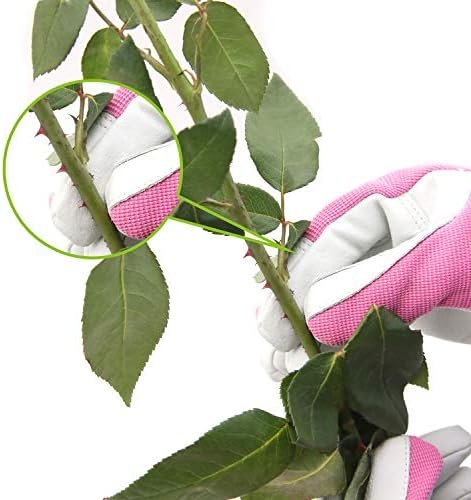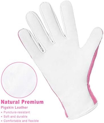 Color Pink, Blue, Orange, Lavender purple Size Small, Medium, Large Material Palm: Natural pig leather; Back: 100% polyester Package 1 (pair) X Womens gardening gloves