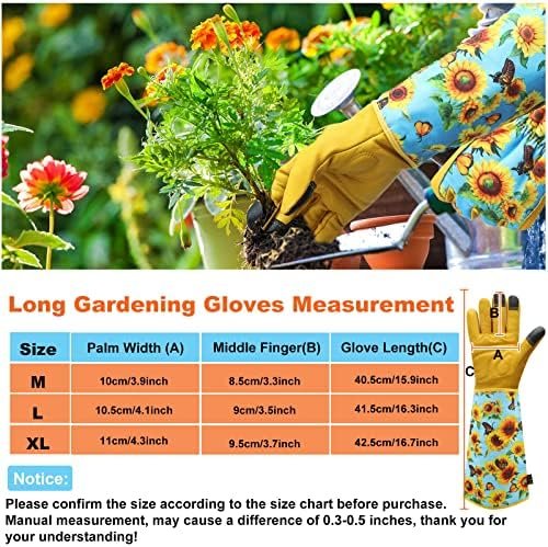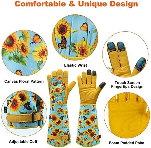 【High Quality Long Gardening Gloves】The palms and fingers of gardening gloves for women are made of carefully selected high-quality 100% cowhide leather and the palms with foam pads to ensure abrasion resistance and grip. The back of the hand and forearm are made of breathable and sweat-absorbent canvas material with bright floral patterns, which are breathable, and soft and comfortable.