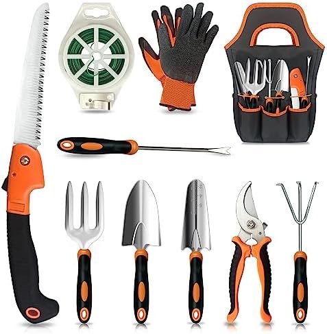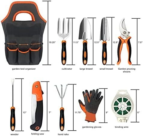 【10 Pieces Premium Gardening tools】Our 10-in-1 Gardening kit is perfect for your home garden work.This tools mainly includes: garden shears,cultivator,weeder,hand rake,folding saw,large shovel,small shovel,gardening gloves,binding wire and 600D Oxford garden tool organizer.Having such a wide variety of tools can make your willing work more comfortable.