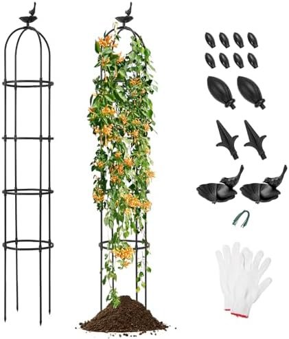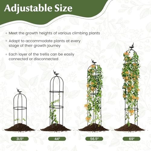 [Adjustable Size]: The 69” tall garden obelisk trellis comes with 3 height options-31.5”, 44”, 56.5”, and 69”, which meet the growth heights of various climbing plants, and adapt to accommodate plants at every stage of their growth journey. And each layer of the trellis can be easily connected or disconnected.