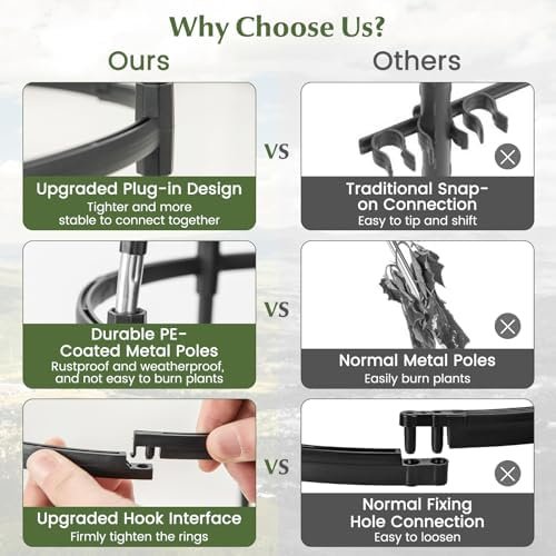 [Easy & Quick Installation]: In contrast to traditional snap-on connections that are easy to tip and shift, our metal poles adopt upgraded plug-in design, which is tighter and more stable to connect together. And the supporting rings are firmly fixed by upgraded hook interfaces, requiring no tools for simple assembly. Besides, it comes with bottom sharp caps with watertight closures, making it easy to insert into the soil.