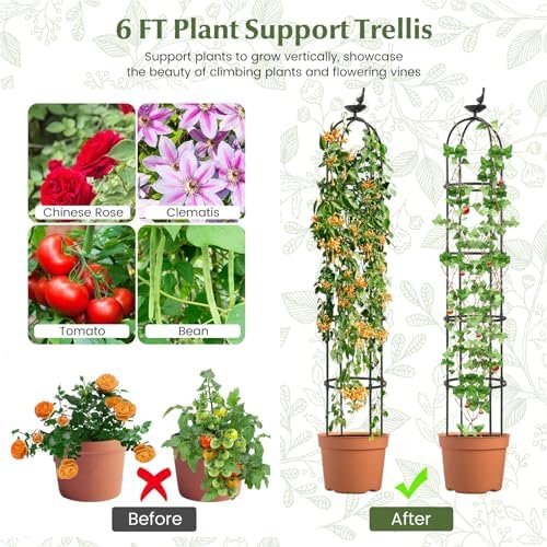 [2-in-1 Design for Various Plants]: These garden trellises can be used as plant cages to protect your delicate potted plants, or used as plant supports, enabling climbing plants to grow upward. They are suitable for various climbing plants to thrive, such as Chinese roses, clematis, tomatoes, beans, morning glories, and more.