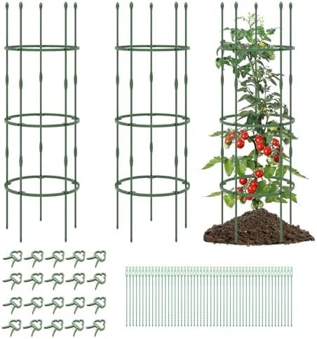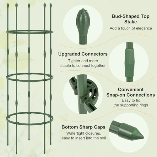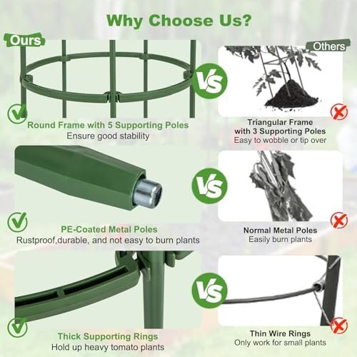 [Durable & Safe Materials]: Our tomato trellis is constructed of PE-coated metal poles, which is rustproof, durable, and not easy to burn plants. Moreover, with a round frame and 5 supporting poles, along with thick supporting rings, it provides reliable and long-lasting structural stability.