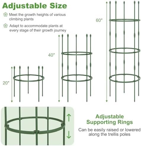 [Adjustable Size: The 60” tall plant support trellis comes with 3 height options-20”/40”/60”, which meet the growth heights of various climbing plants, and adapt to accommodate plants at every stage of their growth journey. Additionally, the trellises can also be combined to create even taller sizes. And the supporting rings can be easily raised or lowered along the trellis poles.