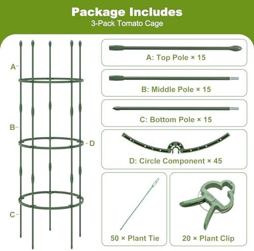 Our tomato trellises include 3 packs and each trellis measures 20” x 60” (Dia. x H). And the trellis can be adjusted to 3 different heights: 20”/40”/60”, enabling you to accommodate the growth needs of various climbing plants. Other than that, in contrast to normal metal poles that would easily burn plants, our rustproof PE-coated metal poles are safe to use around your plants, minimizing the risk of plant injury. Thanks to the upgraded pole connectors and convenient snap-on connections, installation is a breeze, and it requires no tools. And the bottom of each trellis is equipped with sharp caps, allowing for easy insertion into the soil. Not only can our garden trellis be used as plant cages to provide support, but it also serves as a plant support trellis, encouraging upward growth. It is suitable for a wide range of climbing plants, including vegetables, fruits, and flowers.