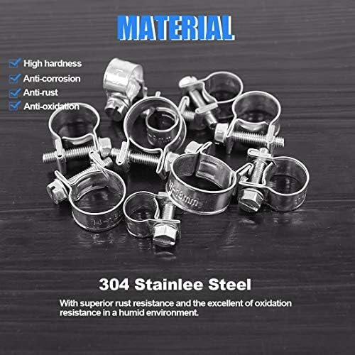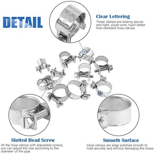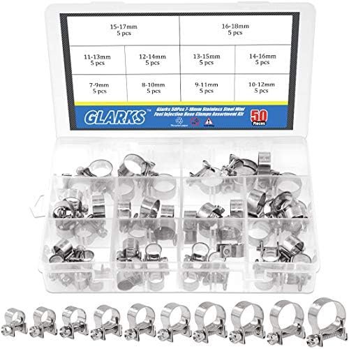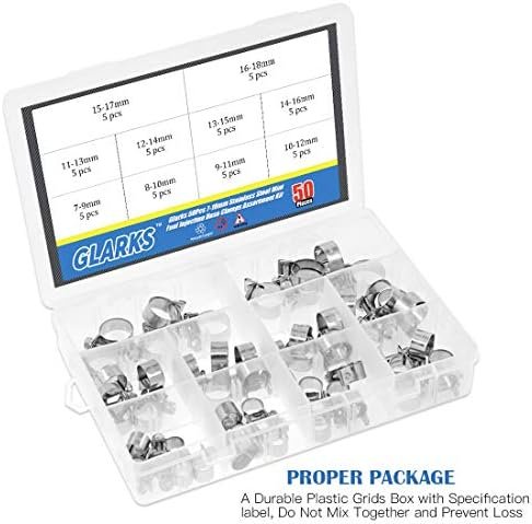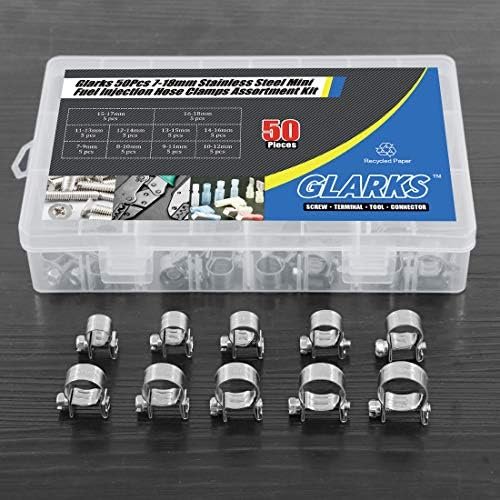 Glarks 50Pcs 7-18mm Stainless Steel Mini Fuel Injection Hose Clamps Adjustable Pipe Hose Clip Tube Clamps Assortment Kit