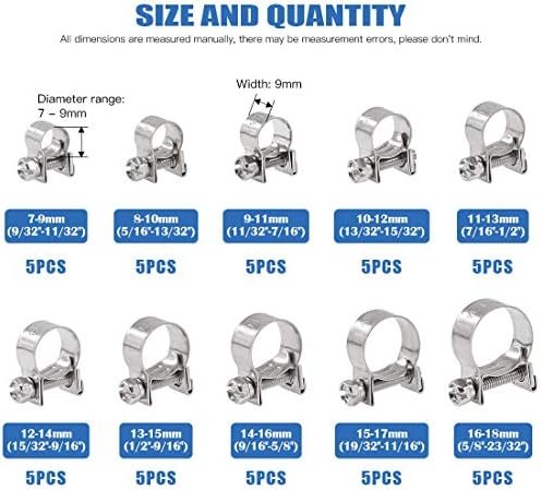 ☀【Wide Hose Clamp Size:】 In this set, we provide 10 size of fuel injection hose clamps which are 7-9mm, 8-10mm, 9-11mm, 10-12mm, 11-13mm, 12-14mm, 13-15mm, 14-16mm, 15-17mm, 16-18mm each for 5pcs total 50pcs packed in a plastic box, easy to storage and carry.