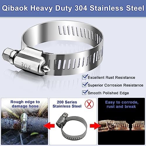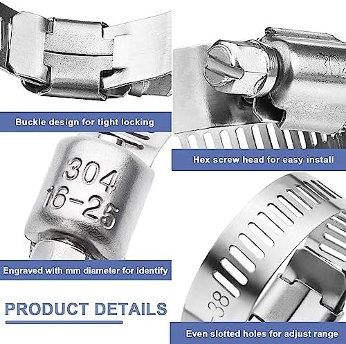 ❣【Hose Clamps Stainless Steel】- The buckle, band and screw of these metal hose clamps are all made of heavy duty 304 SS. Hose clamp kit has the features of corrosion-resistant, anti-rust, salt resistant, waterproof and oil proof. No longer worry about them rusting and breaking when used in indoor and outdoor places.