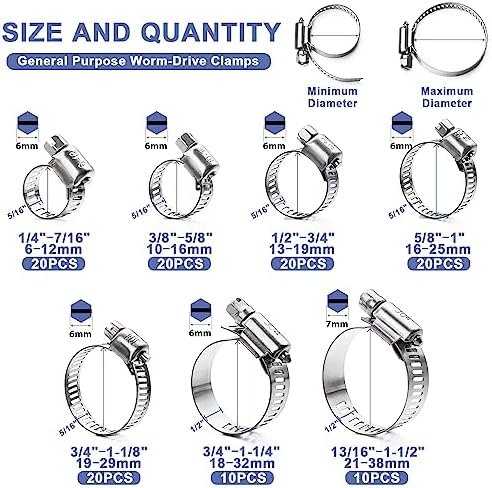 ❣【Wide Adjustable Size Range】- Total 120 pcs hose clamps assortment are flexible and ductile, range from 1/4 inch to 1-1/2 inch (6mm to 38mm). 20pcs 1/4” to 7/16”, 20pcs 3/8” to 5/8”, 20pcs 1/2” to 3/4″, 20pcs 5/8” to 1”, 20pcs 3/4” to 1-1/8”, 10pcs 3/4” to 1-1/4” and 10pcs 13/16” to 1-1/2”.