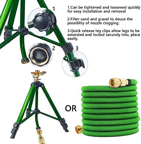 Easy to Use: The adjustable tripod sprinkler base can be extended from 16 to 27 inch, can be locked through the swivel bolt on the goose neck hose. Equipped with a rubber filter O-ring which can filter the sand and gravel, prevent the nozzle from clogging. The goose hose is easy to connect with 3/4 inch US standard garden hose.