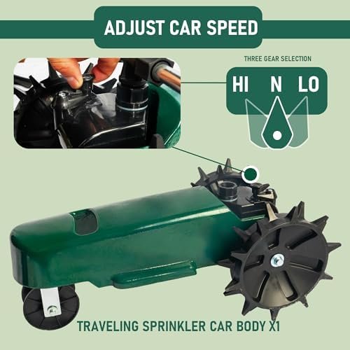 3 Speed Control: Offering 3 speed settings, the sprinkler can move “Low” for slower traversal and deeper watering, “High” for faster movement with lighter watering, or set to “Neutral” to stop movement and water a static area. Adjust speeds simply by lifting and rotating the speed selection knob.