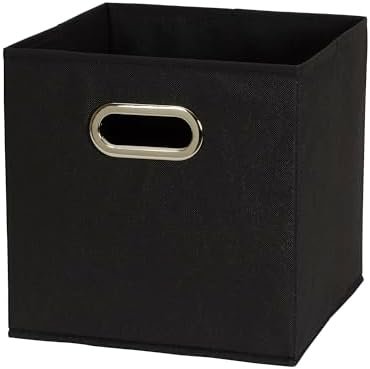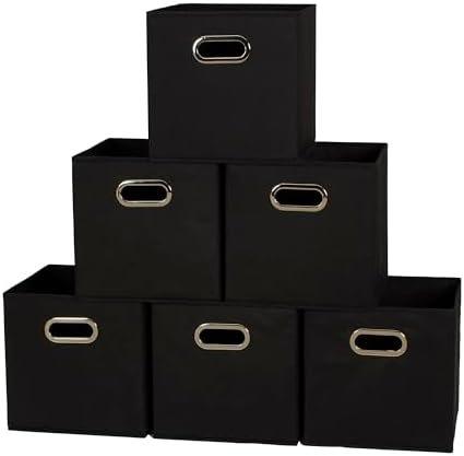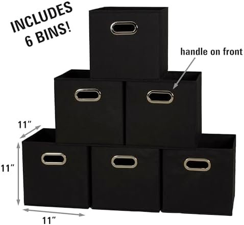 Household essentials set of 6 black fabric storage bin cubes are classic collapsible storage bins with a single grommet handle for pull-out storage that is Fast, simple, and completely color-coordinated. This great set of storage bins transforms home and office clutter into great design. Each bin has sturdy fiberboard sides and base with durably polypropylene fabric on top. PP cloth is strong and durable, and it wipes clean with a damp cloth. Ideally sized to fit on shelves or inside open cubes for a make-shift dresser or desk, these cloth storage bins keep organization simple. Perfect for organizing clothing, accessories, cosmetics, toiletries, office supplies and more! Each bin in this set of 6 is 11 inches high, 11 inches wide, and 11 inches deep.