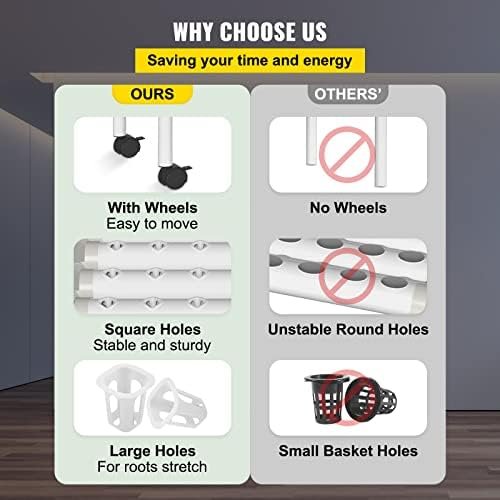 Easy to Install & Use: Our hydroponics system includes 1 set of planting pipes, 4 wheels, 1 timer, 1 water pump, 1 hose, 1 power plug, 108 planting baskets, 108 sponges, 1 tweezers, 1 rubber hammer, and 1 instruction manual. Four wheels make it easy to move, allowing the plants to get enough sunlight.