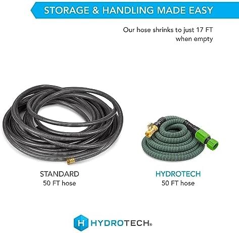 EXPANDABLE – The HydroTech 50ft Expandable Garden Hose is the only garden hose you’ll need. It is lightweight and durable, and shrinks to 17ft when empty, making it ideal to transport anywhere you work.