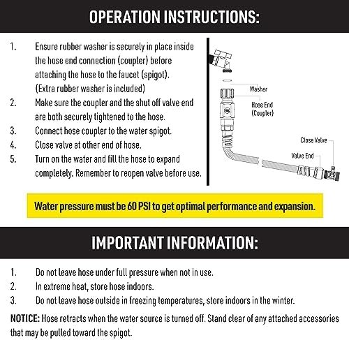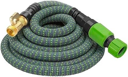 DURABLE – The 50 ft garden hose has a thick latex liner to prevent tears & bursts at the connection point, a heavy-duty brass valve with flow-control shut-off, and a Nylon connector that resists rust and creates a tight seal to the spigot.