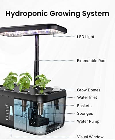 8 Pods, up to 15″ tall: Grows 8 plants in a time in this hydroponics growing system kit, adequate for a novice gardener. Max in 15″, enough space for plants to grow, like herbs, vegetables, dwarf tomato, or flower. Plants grow step by step, helping you to become observers.