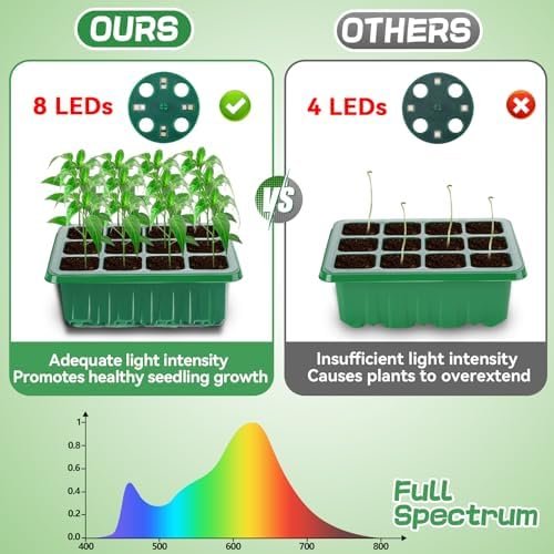 Optimal Light Intensity: Illuminate your seeds with excellence. Featuring 8 LED lights per cover, our seed starter tray provides abundant light, enhancing germination rates and promoting compact, robust seedling development. In contrast 4 LED lights, resulting in inadequate light and causing plants to stretch unnaturally.