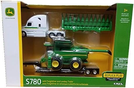Set consists of a 1/64 S780 combine with 712FC folding corn head and Freightliner Cascadia semi-tractor pulling a low boy trailer.