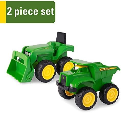 Sandcastles, farms, and roadways are ready to be imagined and built in your child’s sandbox with these John Deere construction vehicle toys. Watch your kids take their outdoor toys to new heights with this pair of officially licensed farm toys. This 2-pack includes a John Deere dump truck featuring a working dump bed and John Deere tractor with a working front loader. Made of heavy-duty plastic and featuring child-friendly designs, these durable John Deere toys are the perfect size for small hands and great for both indoor and outdoor play. Ideal for the sandbox because of their durable plastic construction and child friendly designs, this vehicle two pack is designed for children ages 18 months and older. Outfitted in the iconic John Deere green and yellow color scheme, these vehicles feature free rolling wheels and fully functional parts (moving dump bed and front loader). Watch your child’s imagination grow as they create different ways to play with this dump truck and toy tractor combo.